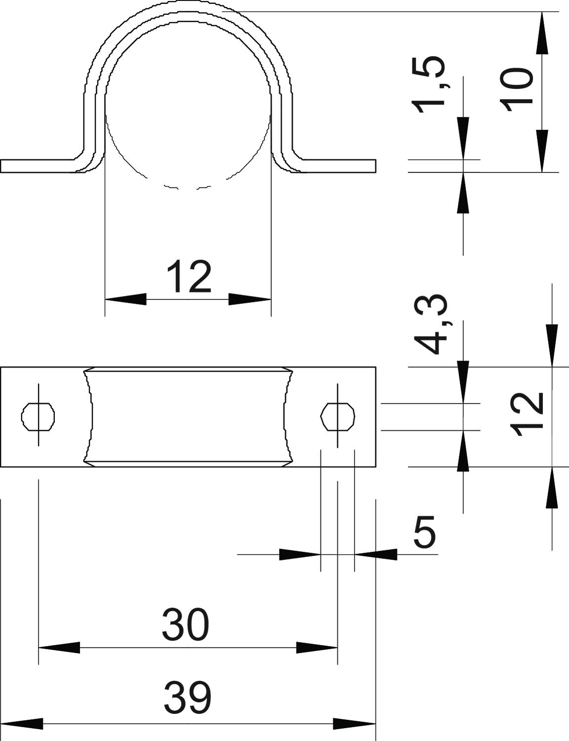 CO2 Footprint (GWP) Cradle-to-Gate 0,015 kg CO2e / 1 Piece Dimension 12mm Dimension A 39 mm Dimension b 12 mm Dimension B 30 mm Dimension d 4,3 mm Dimension D 12 mm Dimension e 5 mm Dimension H 10 mm Dimension L 39 mm Dimension t 1,5 mm Distance to the wall no Fastening type Screw hole For diameter 12 Halogen-free yes Height 10 mm Hole size 4,3 x 5 mm Length 39 mm Material Steel Material thickness 1,5 mm Nominal diameter 12 mm Number of cables/pipes 1 Plastic-covered no Suitable in fire protection area no Surface Electrogalvanized, transparently passivated UV-resistant yes Version for Two-lobe Width 12 mm - All types