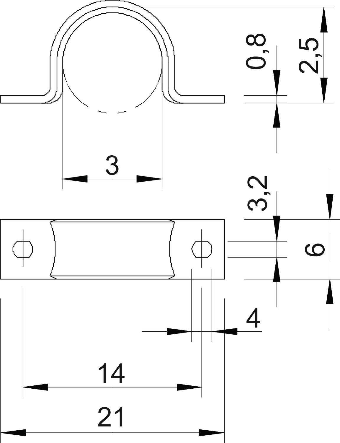 CO2 Footprint (GWP) Cradle-to-Gate 0,0021 kg CO2e / 1 Piece Dimension 3mm Dimension A 21 mm Dimension b 6 mm Dimension B 14 mm Dimension D 3 mm Dimension d 3,2 mm Dimension e 4 mm Dimension H 2,5 mm Dimension L 21 mm Dimension t 0,8 mm Distance to the wall no Fastening type Screw hole For diameter 3 Halogen-free yes Height 2,5 mm Hole size 3,2 x 4 mm Length 21 mm Material Steel Material thickness 0,8 mm Nominal diameter 3 mm Number of cables/pipes 1 Plastic-covered no Suitable in fire protection area no Surface Electrogalvanized, transparently passivated UV-resistant yes Version for Two-lobe Width 6 mm - All types