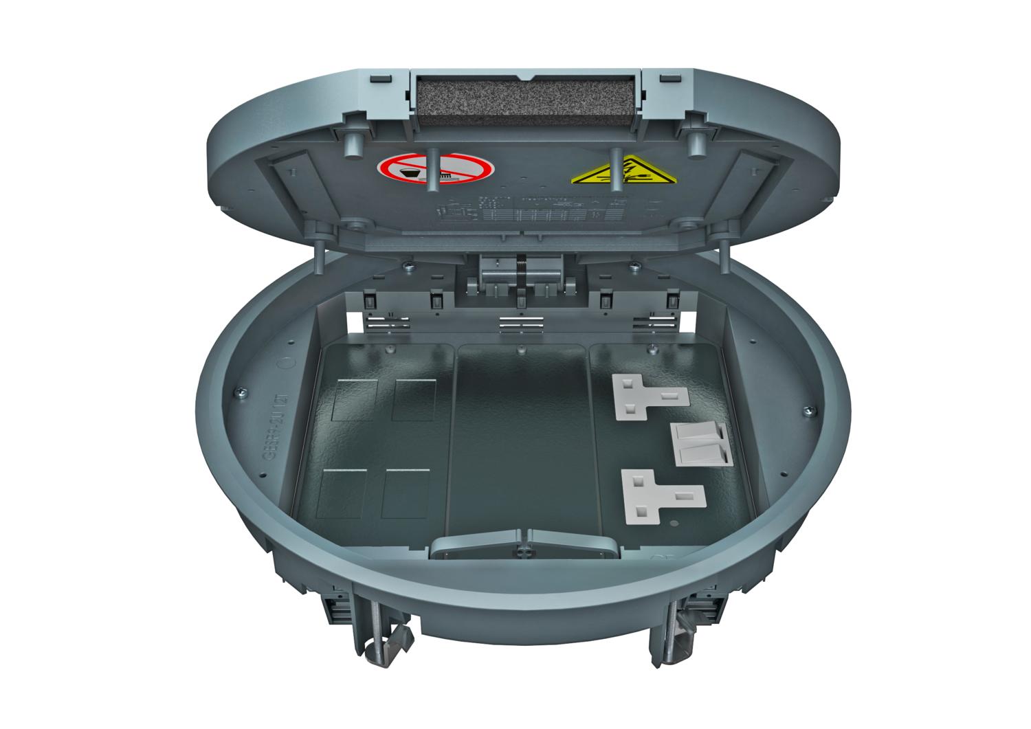 Approvals VDE Cable outlet version Swivellable cord outlet Clamping range D, max. 75 mm Clamping range D, min. 8 mm CO2 Footprint (GWP) Cradle-to-Gate 8,1783 kg CO2e / 1 Piece Colour Iron grey; RAL 7011 Device support to accept mounting boxes yes Dimension Ø324x68 External diameter 324 mm Floor care Dry Floor covering protection frame yes Floor covering thickness 5 mm Floor covering thickness max. 12 mm Floor height, min. 72 mm Frame version Carpet protection frame Heavy-duty version no Installation depth 73 mm Installation diameter 304 Installation system type UT4 Material Polyamide Nominal size for device installation units R9 Number of installable devices 12 Number of mounting boxes 3 Opening mechanism Locking slider Protection rating (IP) when unused IP40 Protection rating (IP) when used IP20 Protection rating IK code IK08 Seal installation option no Suitable for cavity floor installation yes Suitable for raised floor installation yes Suitable for screed-covered underfloor ducts yes Suitable for screed-flush closed underfloor ducts yes Suitable for underfloor ducts yes Suitable for wet care no Version for Round Vertical load, large area to 5,000 N Vertical load, small area to 3,000 N With floor covering recess yes - All types
