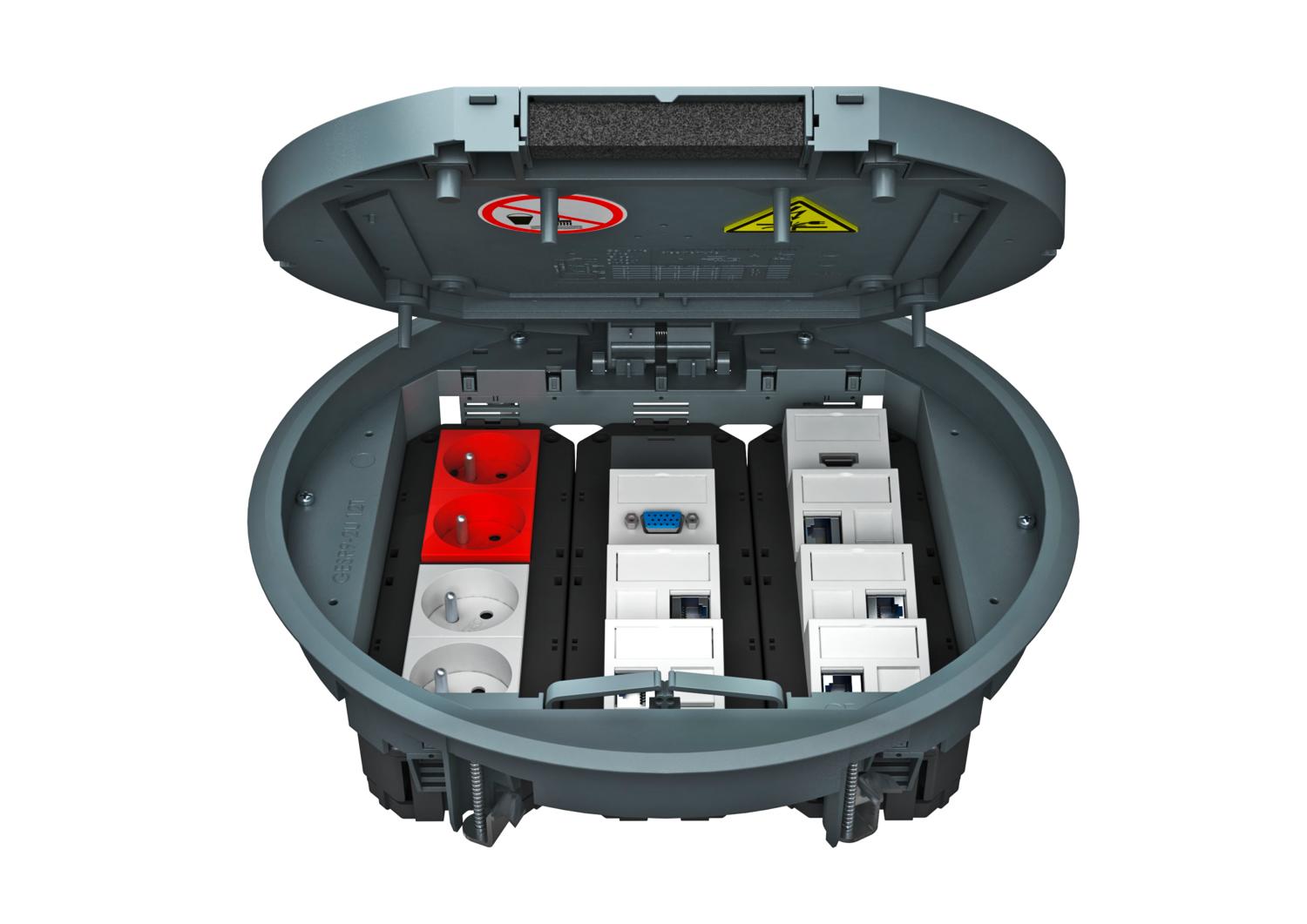 Product descriptionService outlet with locking slider for up to 12 individual Modul 45 devices in 3 UT4 universal supports, use in duct and trunking systems and system floors.