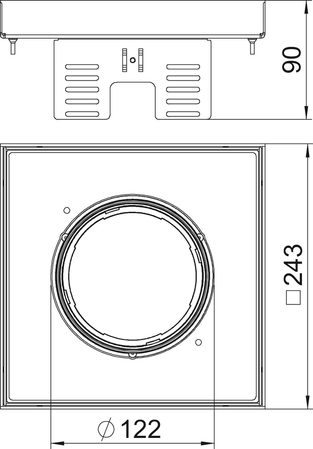 Approvals VDE Cable outlet version Lowerable tube body CO2 Footprint (GWP) Cradle-to-Gate 20,5204 kg CO2e / 1 Piece Decouplable yes Device support to accept mounting boxes no Dimension 243x243mm Dimension h 90 mm Floor care Wet Floor covering thickness 20 mm Floor height, min. 105 mm Heavy-duty version no Height 90 mm Installation depth 105 mm Installation system type UT4 Length 243 mm Length of installation dimensions 244 mm Material Stainless steel 1.4301 Nominal size for device installation units 9 Number of cable outlets 1 Number of installable devices 12 Protection rating (IP) when unused IP44 Protection rating (IP) when used IP20 Protection rating IK code IK10 Suitable for cavity floor installation yes Suitable for raised floor installation yes Version for Square Vertical load, large area to 3,000 N Vertical load, small area to 3,000 N Wide installation dimensions 244 mm Width 243 mm - All types