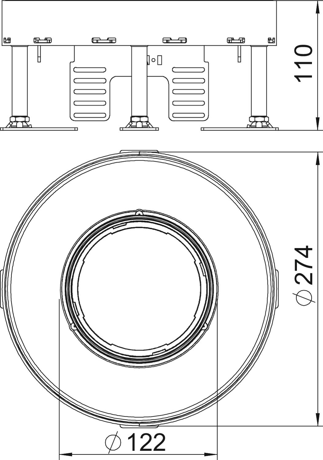 Cable outlet version Lowerable tube body Decouplable no Device support to accept mounting boxes yes Dimension Ø275mm Dimension h 110 mm Floor care Wet Floor covering thickness 20 mm Floor height, max. 155 mm Floor height, min. 105 mm Heavy load class 20 kN (OBO SL2) Heavy-duty version yes Height-adjustment range, max. 155 mm Height-adjustment range, min. 105 mm Installation depth 105 mm Installation diameter 275 Installation system type UT3 / UT4 Material Stainless steel 1.4301 Nominal size for device installation units R7 Number of cable outlets 1 Number of installable devices 10 Number of mounting boxes 3 Protection rating (IP) when unused IP44 Protection rating (IP) when used IP20 Protection rating IK code IK10 Suitable for cavity floor installation yes Suitable for raised floor installation yes Version for Round - All types