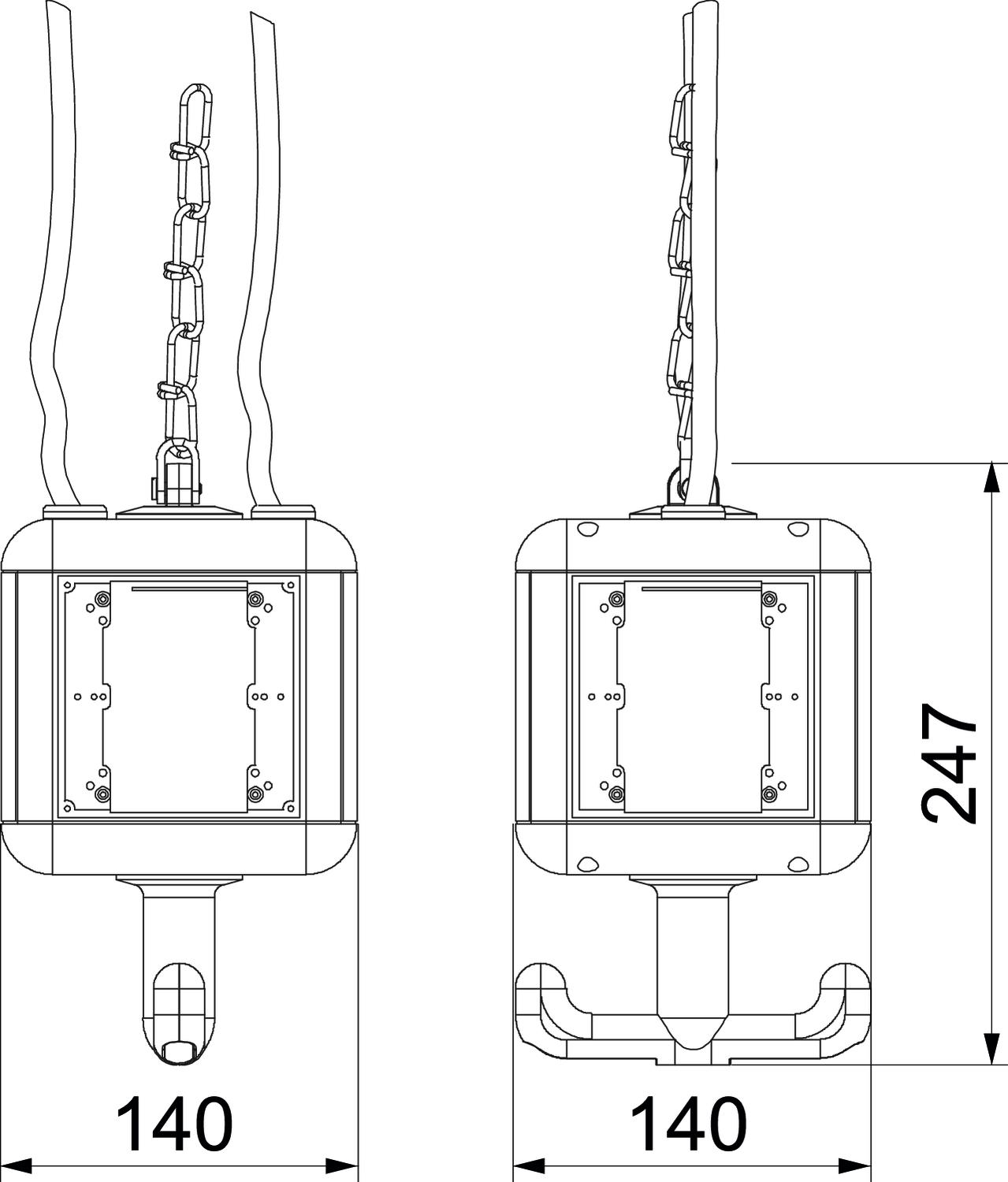 Product descriptionEmpty housing with suspension lug and grip hook, for the installation of four electrical resources, with included partition. Without cover plates.