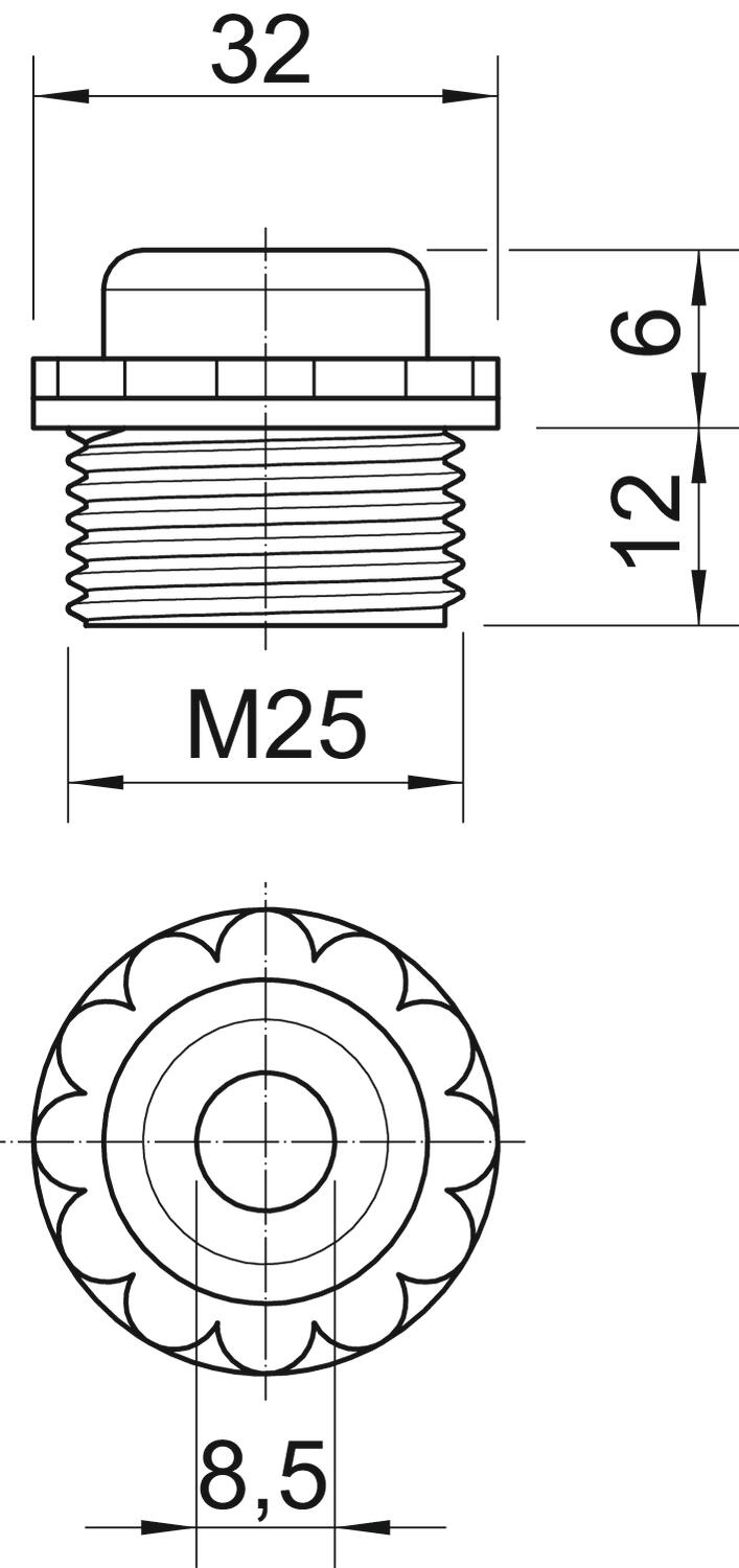 CO2 Footprint (GWP) Cradle-to-Gate 0,0108 kg CO2e / 1 Piece Colour Light grey; RAL 7035 Dimension M25 Dimension D 8,5 mm Dimension E 32 mm Dimension L1 12 mm Dimension L2 6 mm Halogen-free yes Material Polyethylene Protection rating IP54 Size M25 Thread length 12 mm WAF 30 - All types