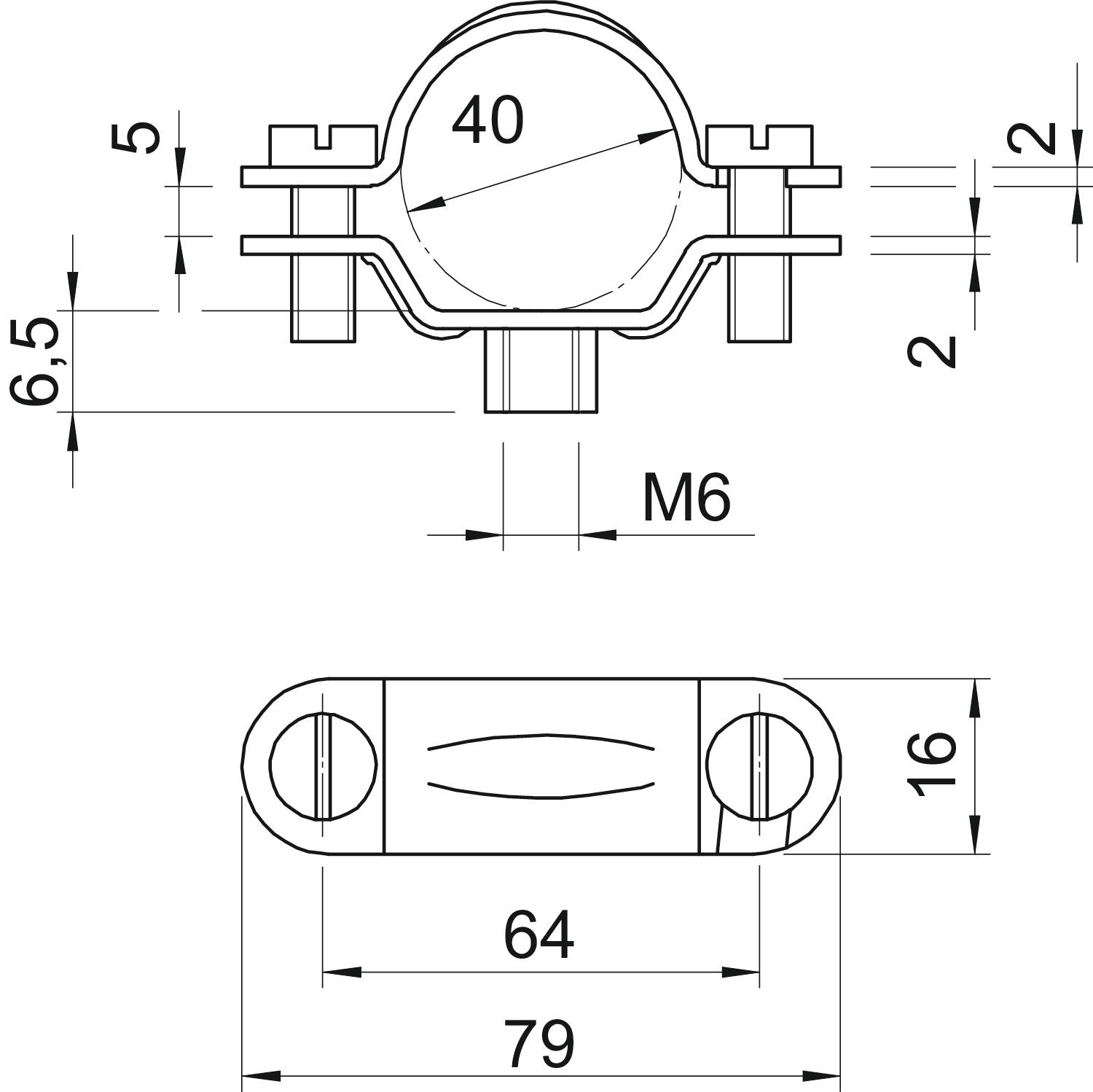 Bolt M5 x 16 Clamping range D, max. 42 mm Clamping range D, min. 39 mm CO2 Footprint (GWP) Cradle-to-Gate 0,1432 kg CO2e / 1 Piece Dimension 39-42mm Dimension A 79 mm Dimension B 64 mm Dimension b 16 mm Dimension D 40 mm Dimension H 6,5 mm Dimension L 79 mm Dimension t1 (mm) 2 Dimension t2 (mm) 2 Dimension x 5 mm Fastening type Screw hole Halogen-free no Hole size M6 mm Length 79 mm Material Steel Material thickness 2 mm Plastic-covered no Size M40 Surface Electrogalvanized UV-resistant yes Version for Closed Width 16 mm - All types