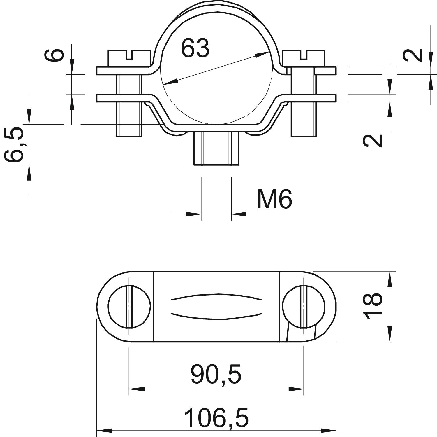 Bolt M6 x 16 Clamping range D, max. 64 mm Clamping range D, min. 61 mm CO2 Footprint (GWP) Cradle-to-Gate 0,2011 kg CO2e / 1 Piece Dimension 61-64mm Dimension A 106,5 mm Dimension B 90,5 mm Dimension b 18 mm Dimension D 63 mm Dimension H 6,5 mm Dimension L 106,5 mm Dimension t1 (mm) 2 Dimension t2 (mm) 2 Dimension x 6 mm Fastening type Screw hole Halogen-free no Hole size M6 mm Length 106,5 mm Material Steel Material thickness 2 mm Plastic-covered no Size M63 Surface Electrogalvanized UV-resistant yes Version for Closed Width 18 mm - All types