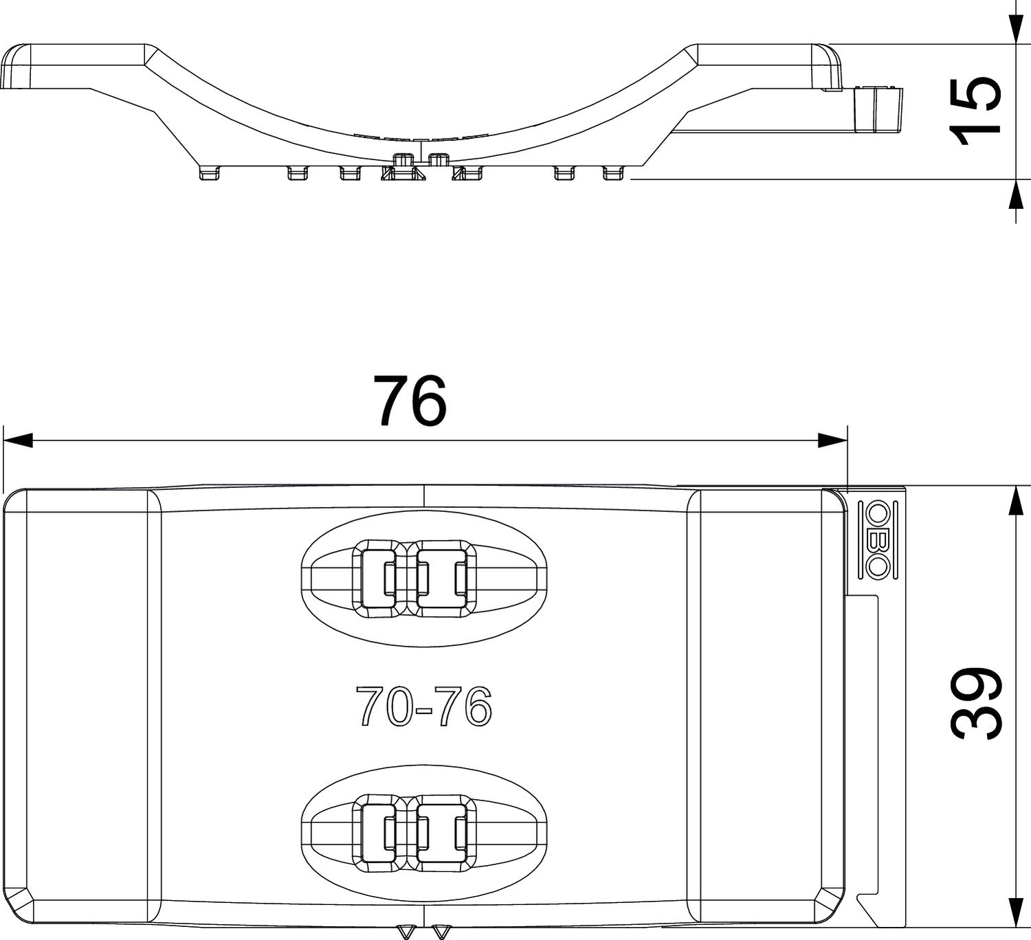 Clamping range D, max. 76 mm Clamping range D, min. 70 mm CO2 Footprint (GWP) Cradle-to-Gate 0,0552 kg CO2e / 1 Piece Colour Light grey; RAL 7035 Counter-trough/clip version Counter sleeve Dimension 70-76mm Dimension B 81,5 mm Dimension H 12,3 mm Dimension L 40 mm Material Polypropylene Suitable for max. cable diameter 76 mm - All types