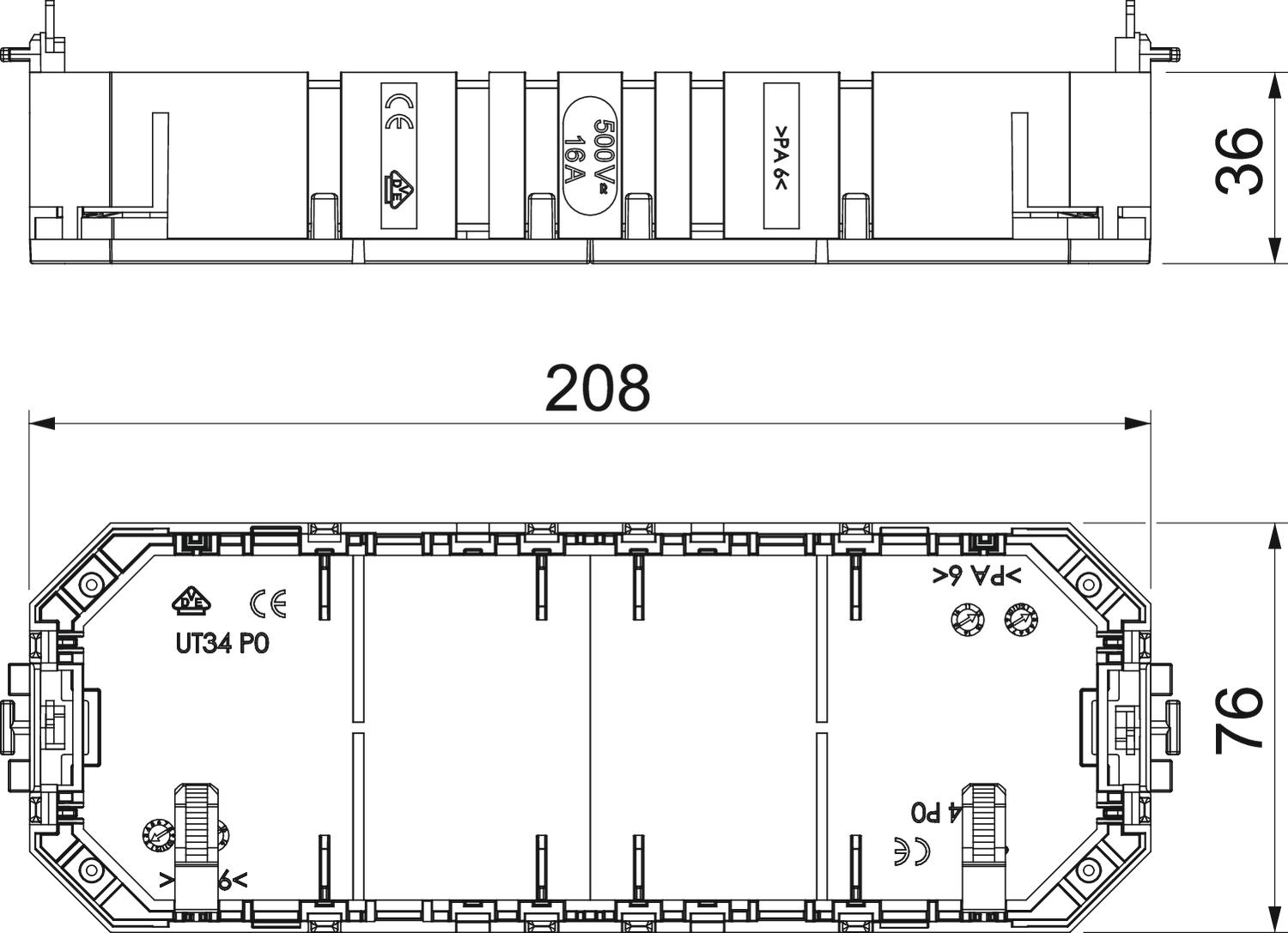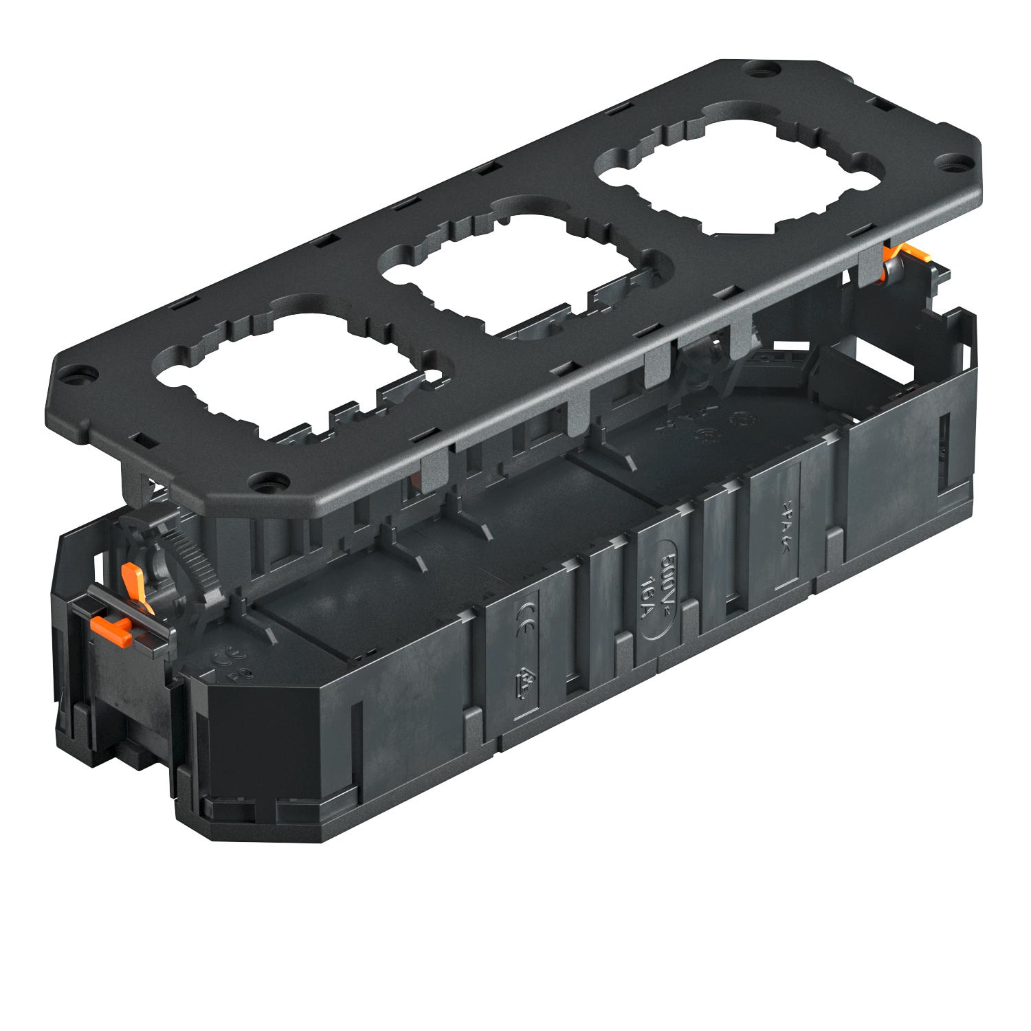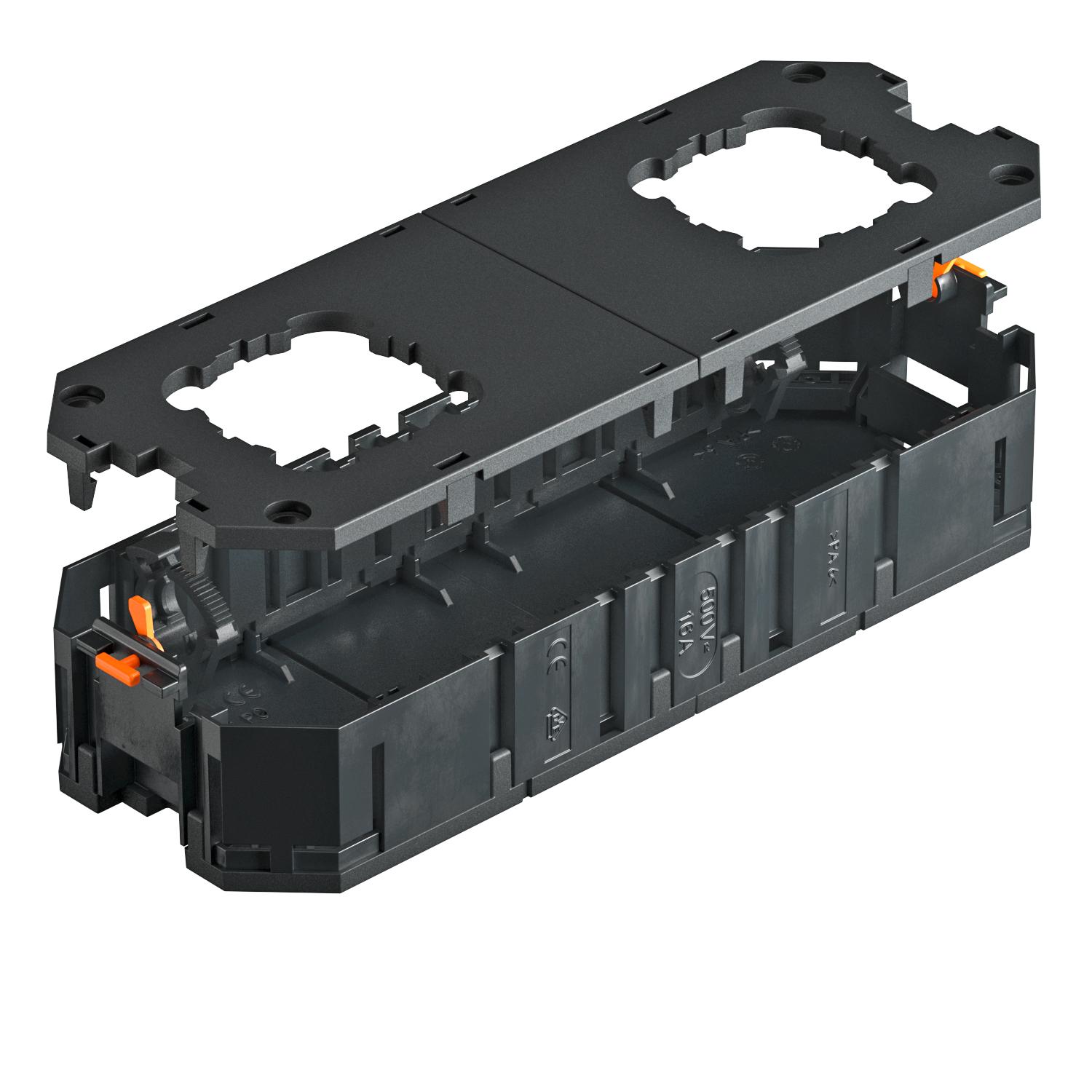 CO2 Footprint (GWP) Cradle-to-Gate 0,4822 kg CO2e / 1 Piece Colour Graphite black; RAL 9011 Dimension 208x76x36 Height 36 mm Installation technology Grid M45 Length 208 mm Material Polyamide No. of entries 4 Number of installable devices 4 Number of strain reliefs 2 Version for Socket shape Width 76 mm - All types